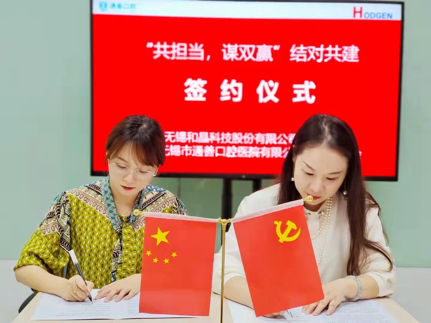 為進(jìn)一步促進(jìn)黨建優(yōu)勢互補(bǔ),激發(fā)黨組織活力,9月29日下午,無錫和晶科技股份有限公司黨支部與無錫通善口腔醫(yī)院有限公司黨支部在和晶科技會議室舉行了結(jié)對共建簽約儀式。